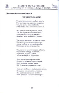 Вышел в свет новый 29-й сборник, издаваемый Московской областной организацией Союза писателей России, «Золотое перо Московии. Антология одного стихотворения», в который вошли лучшие произведения поэтов Москвы и Подмосковья. В книге опубликовано православное стихотворение члена Союза писателей России, благочинного Весьегонского округа протоиерея Анатолия Симоры под названием «Любовь». В произведении говорится о главной христианской добродетели, ее великой духовной и спасительной силе.