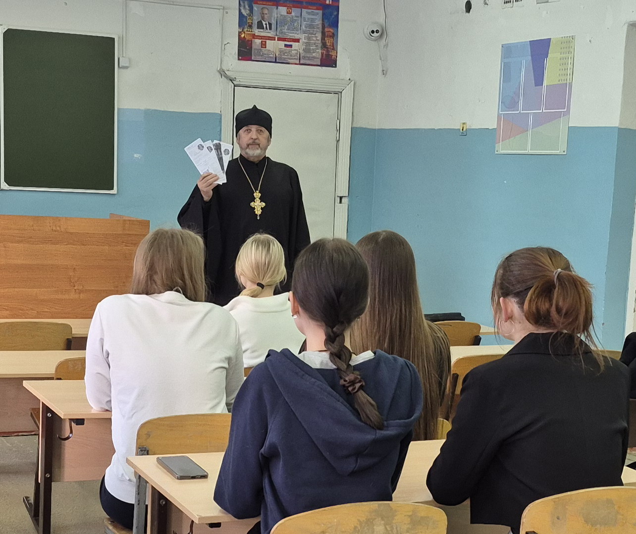 Также батюшка прочитал школьникам душеполезные стихотворения из своих книг, одобренных Издательским советом РПЦ, и подарил им буклеты «Масленица. Великий пост».