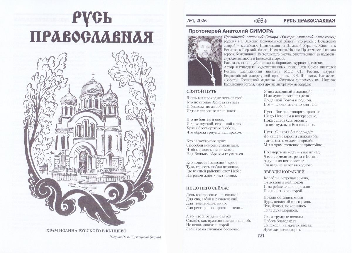 В журнале под рубрикой «Русь православная» опубликованы пятнадцать одобренных Издательским советом РПЦ стихотворений члена Союза писателей России, благочинного Весьегонского округа протоиерея Анатолия Симоры.Среди них «Святой путь», «Не до Него сейчас», «В разрушенном храме», «Не жалейте доброты» и др.