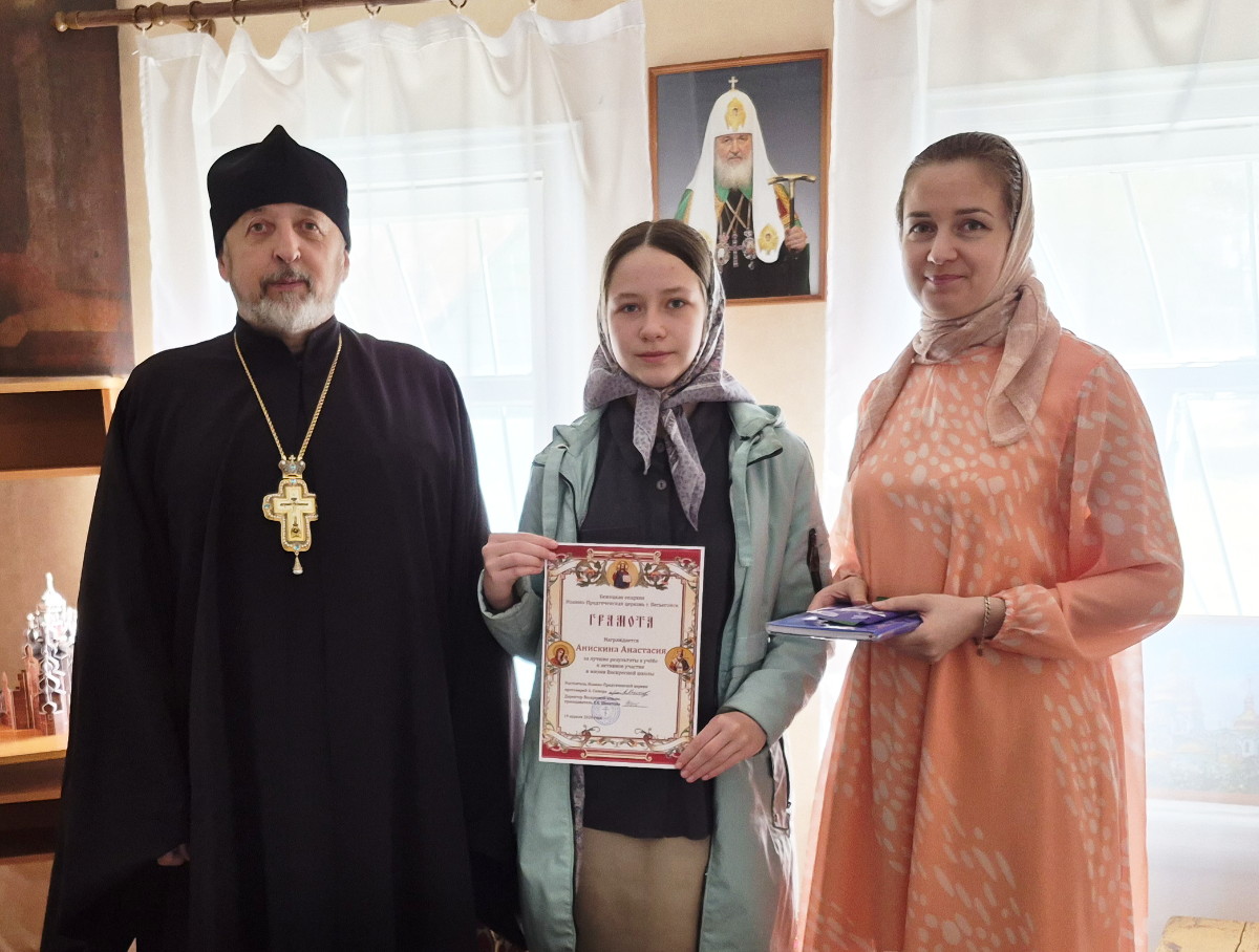 19 апреля, в неделю вторую по Пасхе, в Воскресной школе Иоанно-Предтеченской церкви г. Весьегонск состоялось награждение учащихся. Настоятель храма протоиерей Анатолий Симора поблагодарил директора, преподавателя ВШ Елену Евгеньевну Щепетову за благие труды, за духовно-нравственное воспитание школьников – юных прихожан и выразил благодарность воспитанникам школы. Затем отец Анатолий вручил ученикам Грамоты «за лучшие результаты в учебе и активное участие в жизни Воскресной школы», Грамоты «за успехи в учебе и активное участие в жизни Воскресной школы», Благодарности «за участливое отношение к жизни Воскресной школы», а также – подарки.